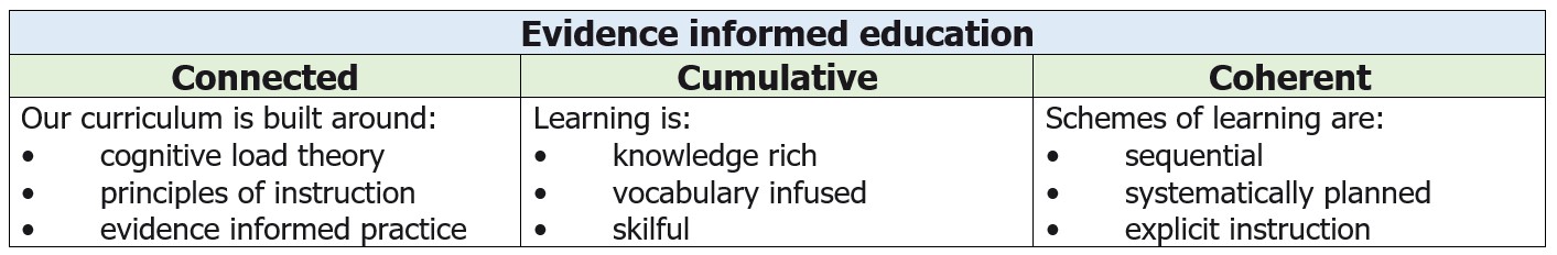 Our curriculum is broad and literacy rich. Schemes of learning are underpinned by evidence, research and cognitive science. There is an emphasis on transcription, oracy, fluency, questioning and vocabulary acquisition alongside retention and recall. Language and vocabulary are deliberately planned and taught alongside our text rich curriculum and modelled reading.